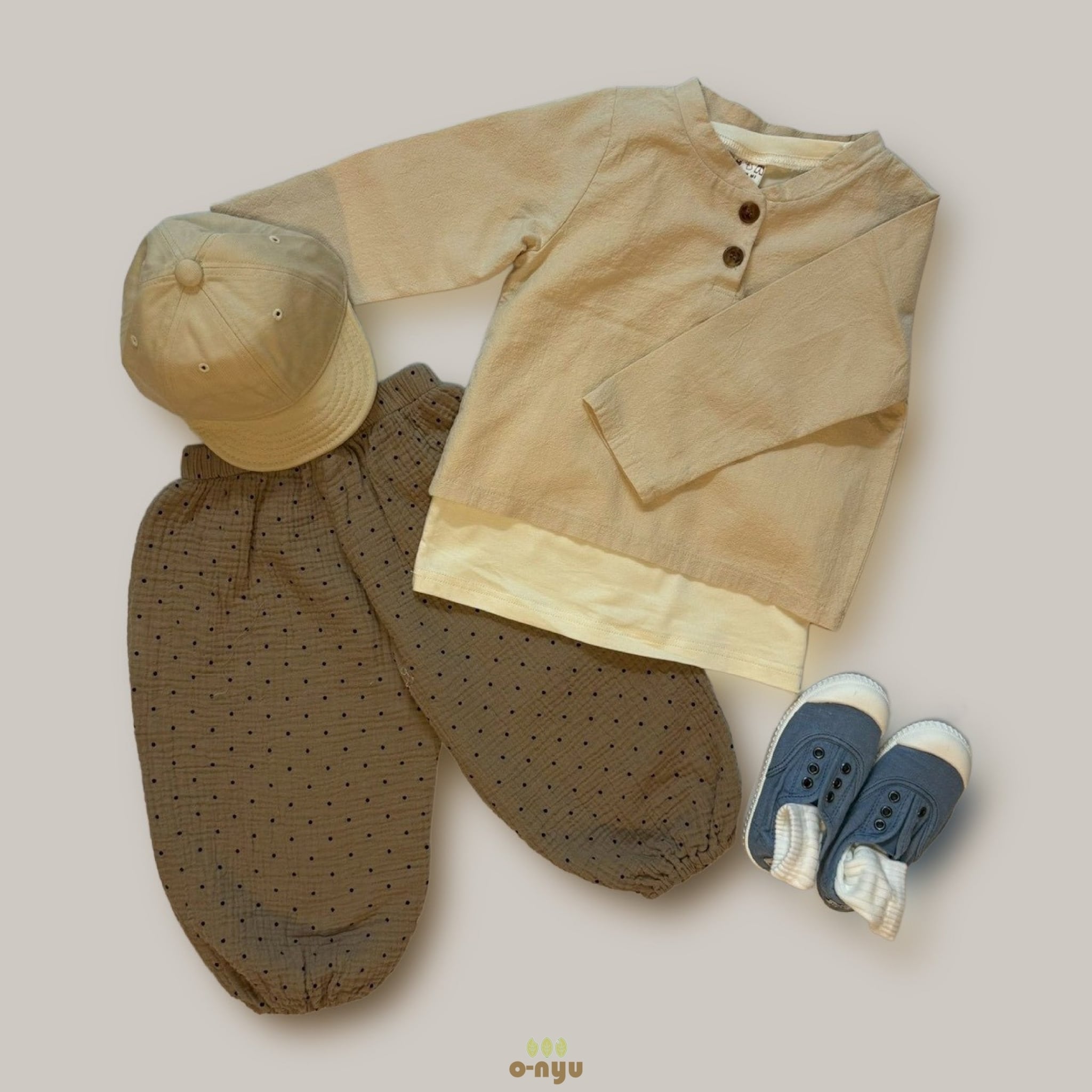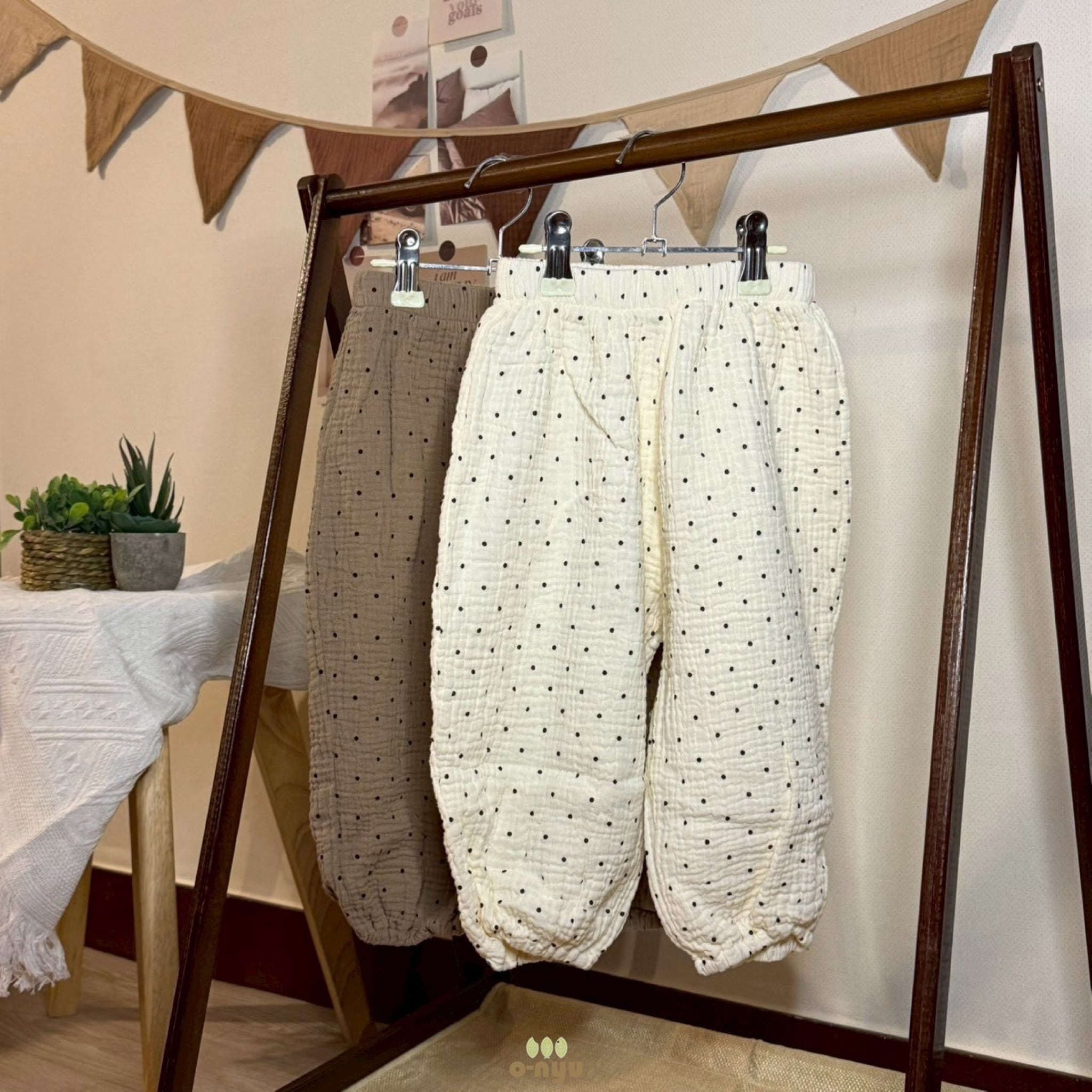 ナチュラルなシワ感と、愛らしいドット柄が特徴のドットブルマです。